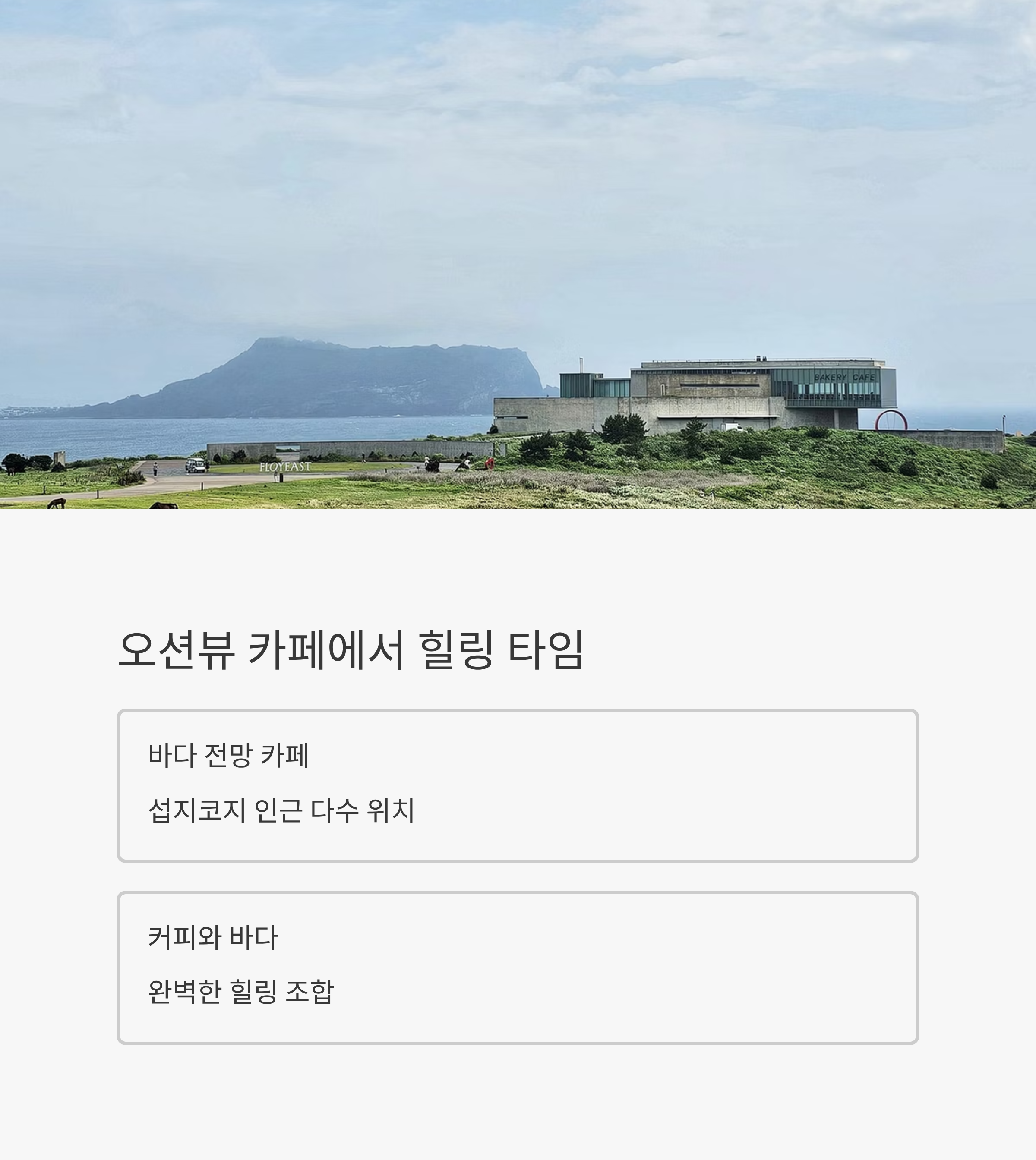 섭지코지 인근에는 오션뷰를 자랑하는 카페들이 많습니다. 여행 중 잠시 쉬어가며 커피 한 잔과 함께 제주 바다를 감상하면 힐링 그 자체입니다.