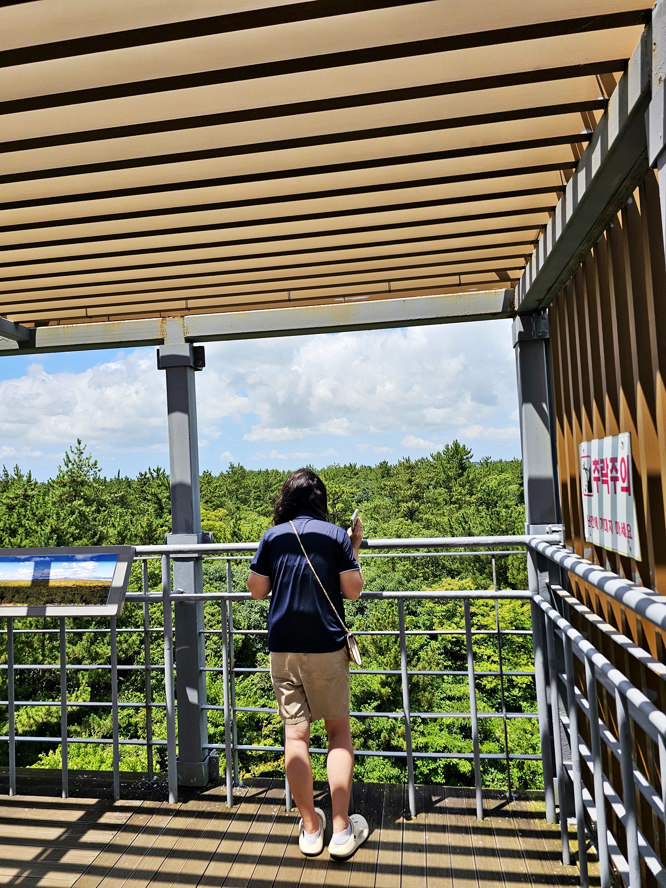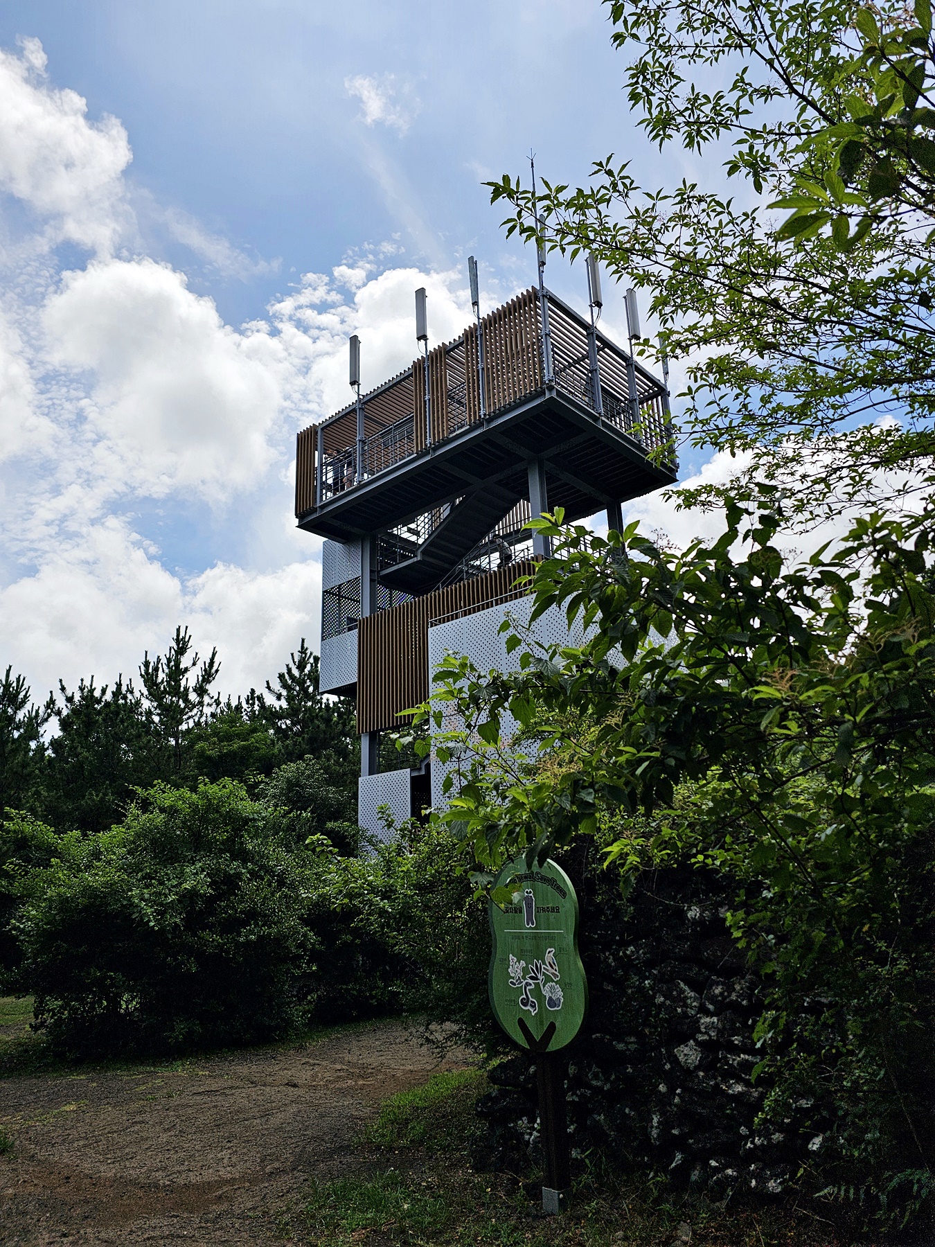 전망대에 들러서 곶자왈 풍경을 한눈에 바라볼수 있습니다. 여름철에는 수분섭취를 위한 음료나 물을 챙여가시길 권합니다.