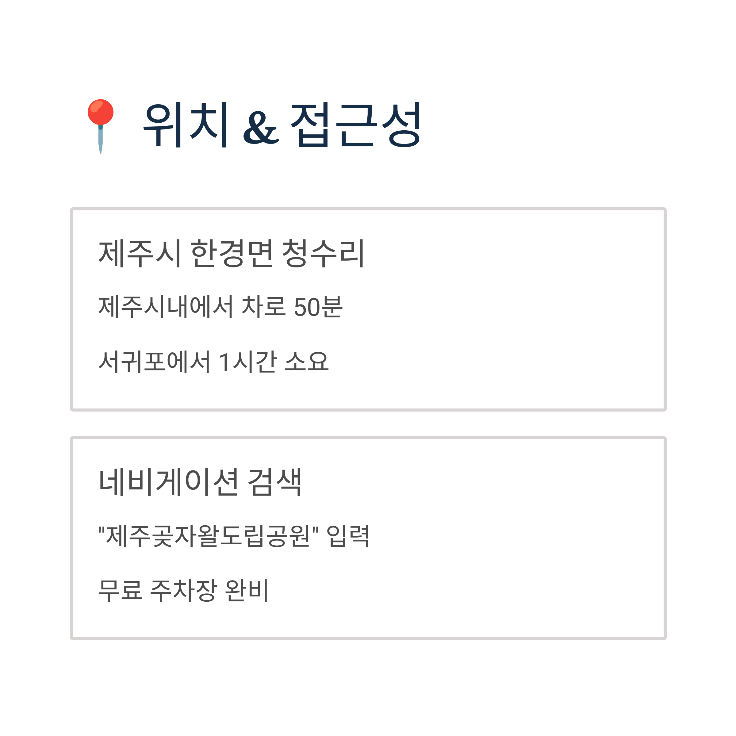 제주시내에서는 자동차로 약 50분, 서귀포에서는 약 1시간 정도 소요됩니다.