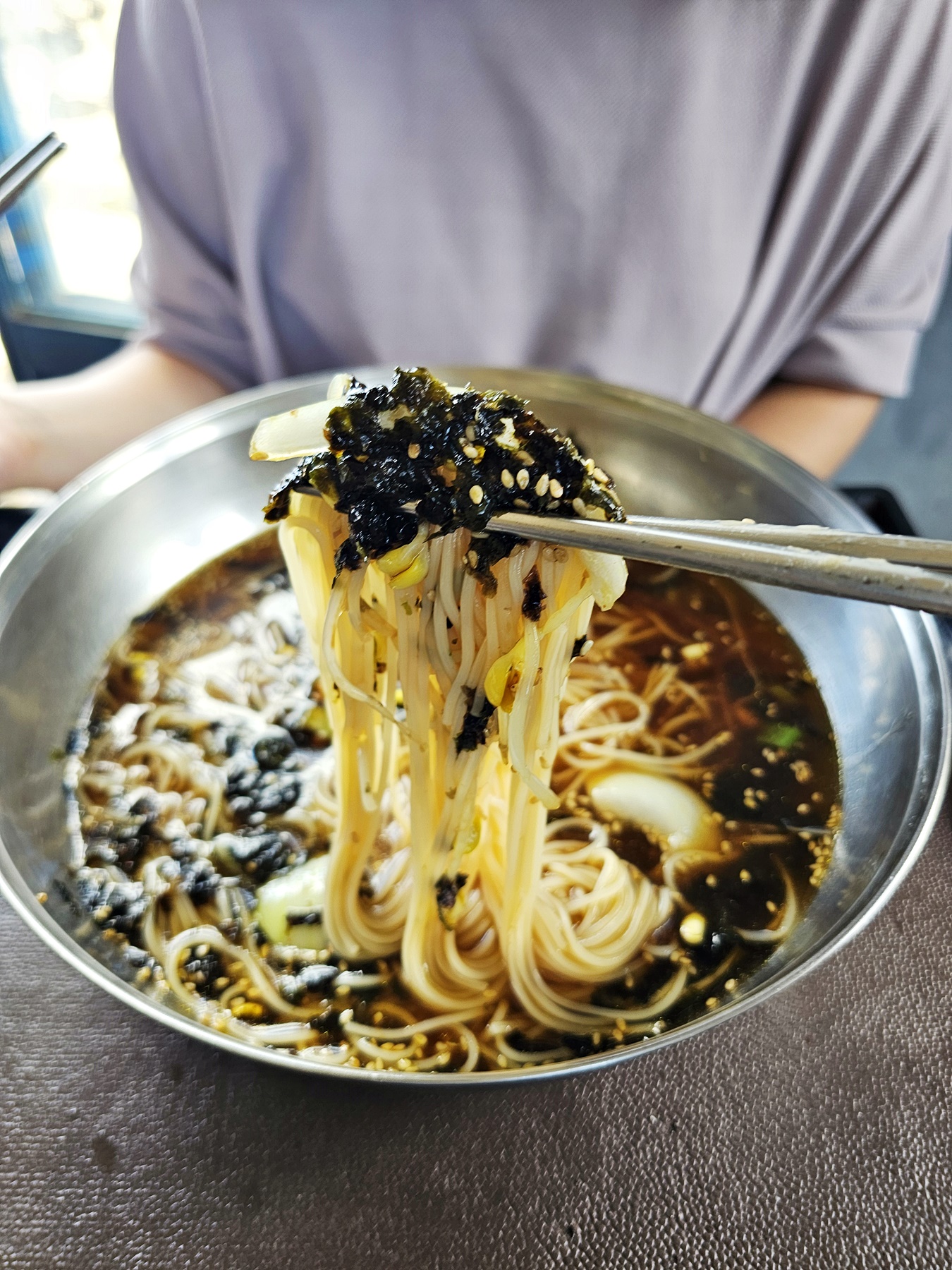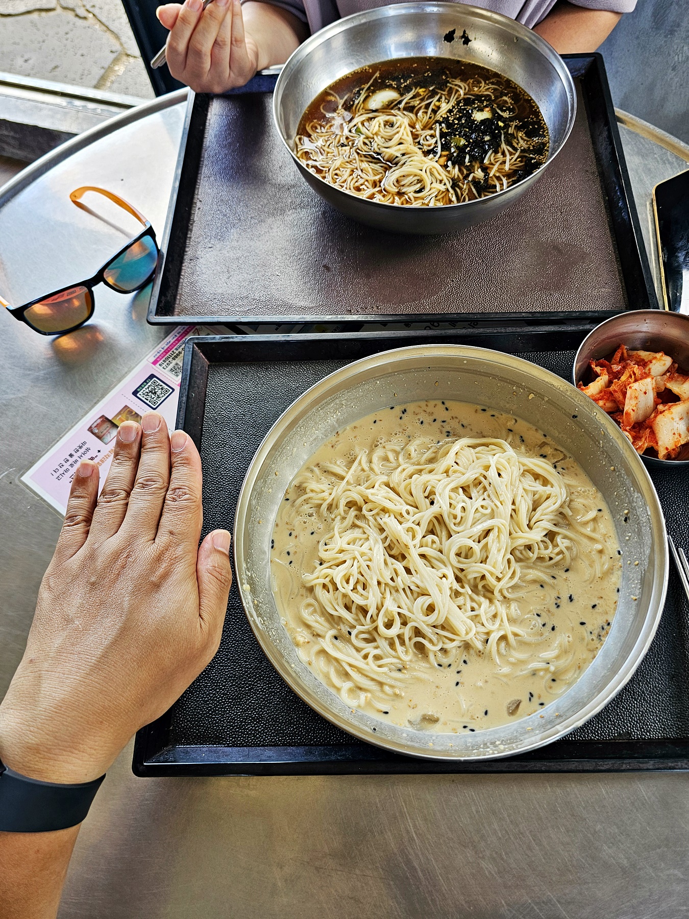 메뉴는 단촐합니다. 잔치국수와 비빔국수입니다. 가격은 무려 5,000원입니다. 계절메뉴로 제주산 콩국수는 7,000원으로 엄청 저렴합니다. 보통과 곱배기가 있었는데, 그릇 크기 차이가 상당했습니다. 보통 사이즈만 해도 양이 넉넉해서 곱배기는 엄두가 안 날 정도였죠. 잔치국수를 먹겠다던 와이프는 에어컨 작동이 안되는 것을 확인후 비빔으로 달라고 했다는데 제가 그만 흘려듣고 잔치국수로 주문했고, 저는 콩국수를 주문했습니다. 다행히 실내는 맞바람으로 그리 많이 덥지 않았고, 와이프는 잔치국수도 맛있다고 만족스레 먹었습니다. 제가 주문한 콩국수도 제대로된 콩국물로 맛있었습니다. 시원하고 고소한 국물이 가득, 와이프와 함께 콩국물을 나눠 먹었습니다.