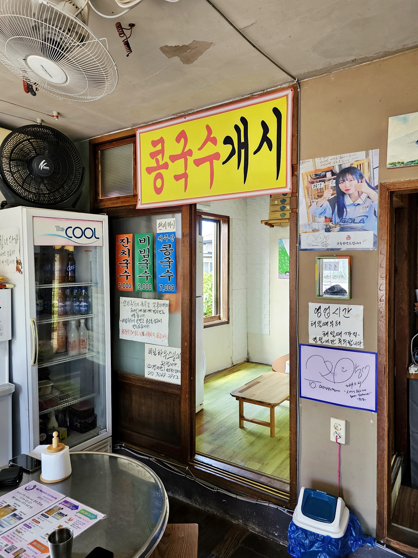 안쪽의 작은 방도 있고 내부에는 간단한 테이블이 몇개 있을 정도로 소박합니다. 인테리어는 아기자기하고 깔끔해 보였습니다. 식당 앞에도 테이블이 보였지만 너무 더워서 이용하시는 분은 없을듯 합니다. 시원한 날씨가 되면 인기가 많아 보입니다. 유독 눈길을 끈 건 **“화학조미료 일절 사용 안 함”**이라는 안내문. 그 한 문장만으로도 사장님의 요리에 대한 고집과 진심이 느껴졌습니다. 아 일반 국수집은 아니구나 생각이 들었습니다.유명 유튜버인 쯔양도 방문했던 사진과 싸인이 보입니다.