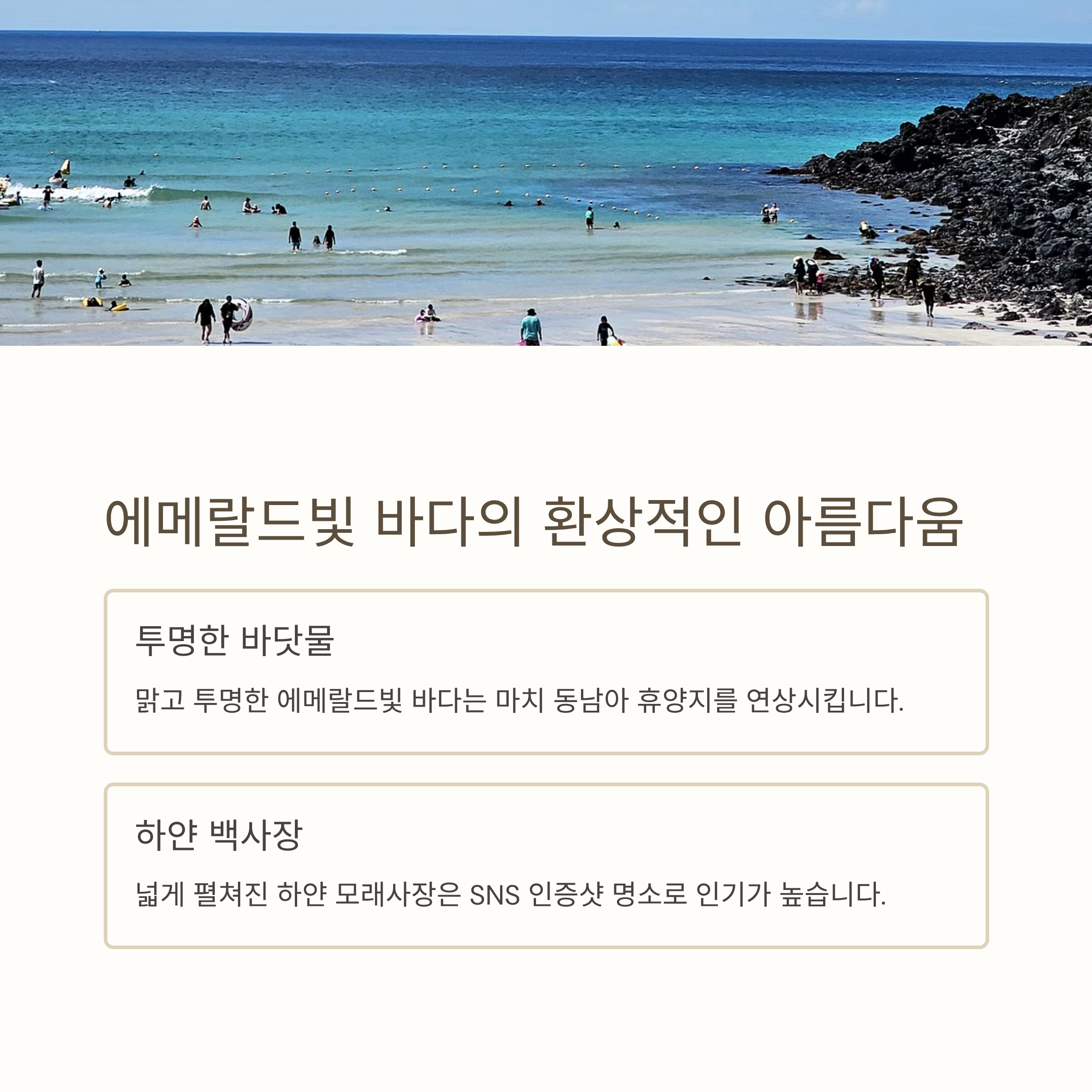 제주도를 대표하는 여름 명소 중 하나인 함덕해수욕장은 매년 수많은 여행객들이 찾는 인기 해변입니다. 맑고 푸른 바다와 하얀 백사장, 주변의 감성적인 카페 거리까지 더해져 자연과 도시 감성이 조화를 이루는 곳이죠. 이번 글에서는 함덕해수욕장의 특징과 그 특별한 아름다움을 자세히 소개해드립니다.