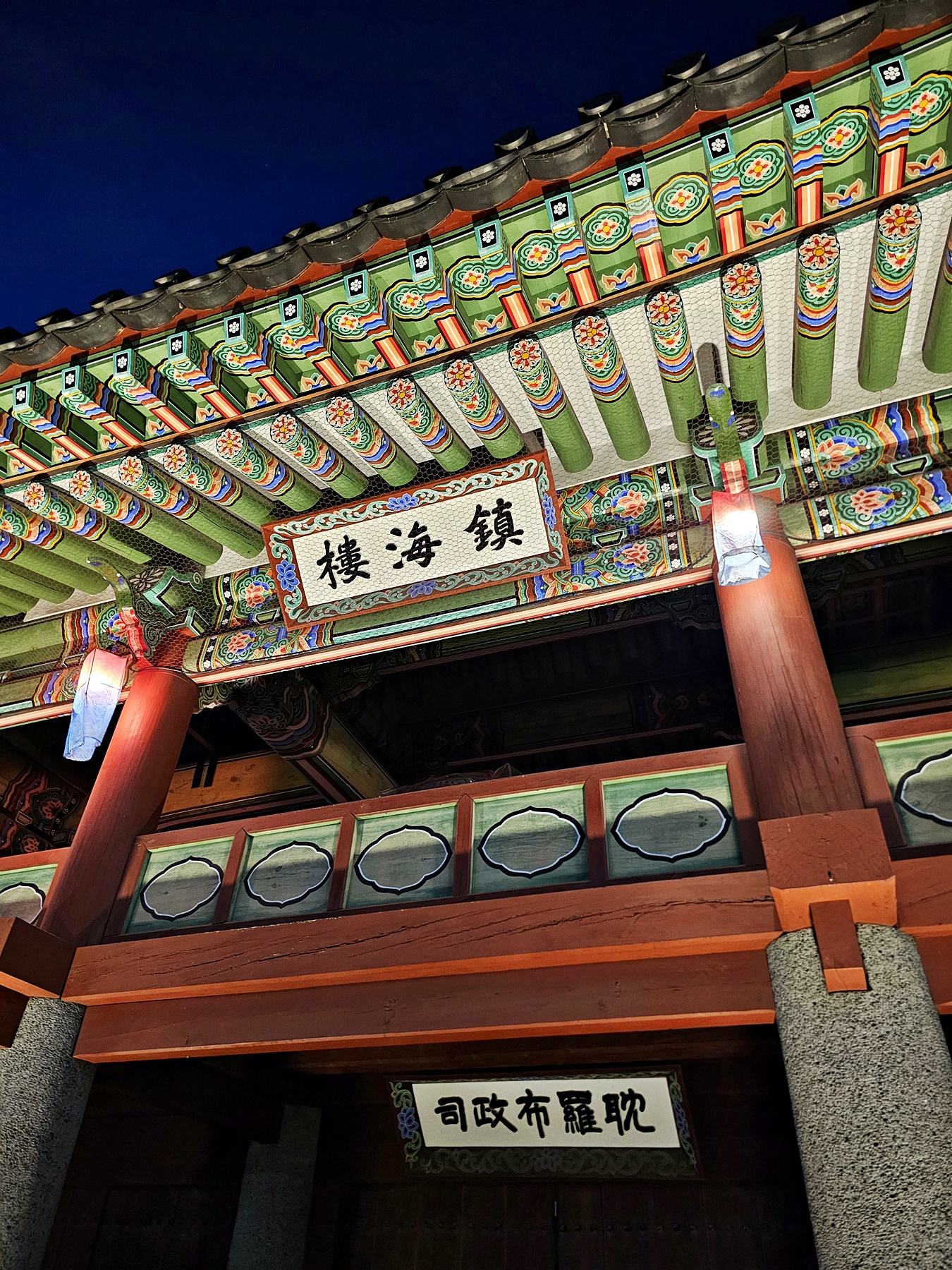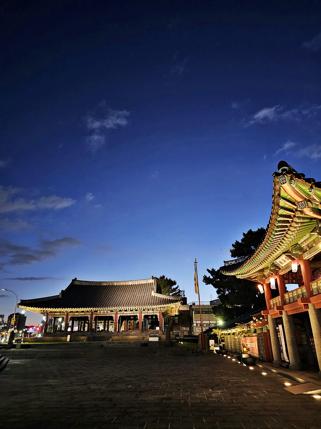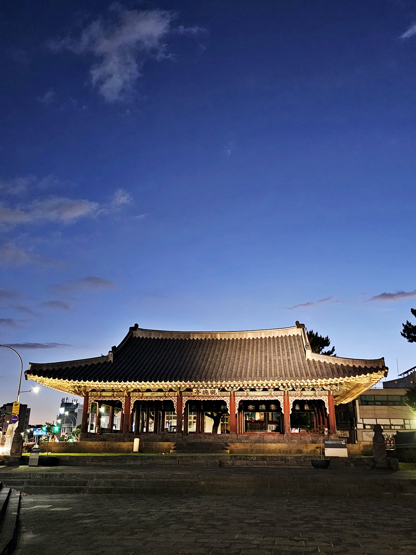 제주목 관아의 진정한 매력은 해가 지고 어둠이 찾아왔을 때 비로소 시작됩니다. 조명이 하나둘씩 켜지기 시작하면, 고즈넉한 옛 건물들은 황금빛으로 물들며 낮과는 전혀 다른 신비로운 분위기를 연출합니다. 특히 웅장한 지붕의 곡선과 화려한 단청이 조명과 어우러져 만들어내는 실루엣은 보는 이들의 탄성을 자아내게 합니다. 밤하늘을 배경으로 고요히 빛나는 제주목 관아는 마치 한 폭의 그림 같으며, 사진을 찍기에도 더할 나위 없이 좋은 장소입니다. 사랑하는 사람과 함께 고즈넉한 밤의 정취를 느끼며 산책하거나, 홀로 사색에 잠기기에도 완벽한 공간입니다. 제주시 도심 한복판에 이런 아름다운 야경 명소가 있다는 사실이 놀랍기만 합니다.